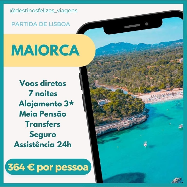 Maiorca é a maior ilha do arquipélago das Baleares, localizada no Mar Mediterrâneo e pertencente a Espanha. Conhecida pelas suas praias de águas cristalinas, enseadas pitorescas e paisagens montanhosas, a ilha é um destino turístico muito popular. Palma, a capital de Maiorca, destaca-se pela sua rica herança histórica, incluindo a impressionante Catedral de Palma e o Castelo de Bellver. Além das suas belezas naturais e culturais, Maiorca também é famosa pela sua vibrante vida noturna, mercados locais e trilhos para caminhadas na Serra de Tramuntana.