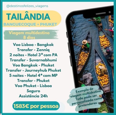 A Tailândia é um país localizado no Sudeste Asiático, conhecido pela sua rica cultura, paisagens deslumbrantes e tradições espirituais. Com uma história milenar, o país combina templos budistas ornamentados, como o famoso Wat Phra Kaew em Banguecoque, com belas praias e ilhas paradisíacas, como Phuket e Koh Phi Phi. A culinária tailandesa é mundialmente apreciada, destacando-se pelos sabores picantes e o equilíbrio entre doce, salgado e azedo. O povo tailandês é reconhecido pela sua hospitalidade, e o país é carinhosamente apelidado de "Terra dos Sorrisos". A monarquia também desempenha um papel importante na sociedade e cultura tailandesas.